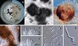 Within the order Pleosporales, it is quite like the common soil genus Phoma, which has asexual spores produced in similar conidia with a glassy appearance, and forming inside structures called pycnidia. However the results of DNA analysis were considered to justify the definition of a new family for this species.[1]