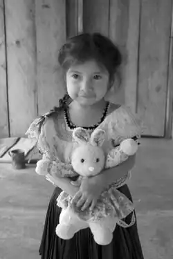 The Tzeltal call themselves Winik atel, which means "Working Men" in their language, or as the “batzil’op” or “those of the original word” referring to the Mayan oral tradition.[2][9] They are largest Indigenous ethnicity with 278,577 people aged five years of age or more in the state of Chiapas who speak the language according to the 2000 census and an estimated 500,000 total, representing 34.41% of the total Indigenous population of Chiapas.[10][11] They are followed by the closely related Tzotzil Maya who also live in the Los Altos region near San Cristóbal.[9] The traditional territory of the Tzeltal is to the northeast and southeast of San Cristóbal in the municipalities of San Juan Cancuc, Chanal, Oxchuc, Tenejapa, Altamirano, Sitalá, Socoltenango, Yajalón, Chilón, Ocosingo, Amatenango del Valle and Aguacatenango .[9] Tzeltal territory is bordered by that of the Tzotzils to the west, the Ch'ols to the north and north east and the Tojolabal to the southeast. The Tzetals in the main concentration distinguish themselves more against “Ladinos” (Spanish speakers, usually of mixed race) and from those Indigenous in the more rural areas.[12] This is mostly due to a history of socioeconomic oppression and conflict with colonial, then later state and federal authorities. However, many Tzeltal practices have survived to the present day because of this group’s large number vis-à-vis the Spanish and Ladinos, giving it a certain amount of power to resist acculturation to European culture.[13]