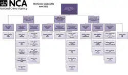 The NCA is organised into eight operational branches, overseen by seven directors, who are in turn overseen by a Director General, assisted by a Deputy Director General.[42] The commands are as follows: