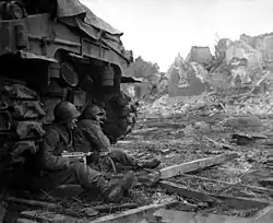 Following a brief rest in July, the division took part in the St. Lo break-through and in August helped close the Falaise Gap. Turning east, the 9th crossed the Marne, 28 August, swept through Saarlautern,[6] and in November and December held defensive positions from Monschau to Losheim.