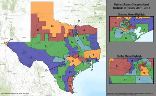 Republicans have complete control of the congressional redistricting process in Texas, as any new maps are drawn and passed by the Republican-held state legislature and signed into law by the Republican governor.[1] This has resulted in Texas’ maps being a partisan gerrymander, with few competitive districts.[2][3]
