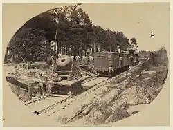 Initial railroad operations began when the USMRR rebuilt and restored service along 9 miles of the Petersburg and City Point Railroad’s line.[32][33] As the Union Army steadily extended its siege lines to the south and west, the USMRR construction corps followed in the Army's wake extending rail service from City Point to positions behind the new Union left flank. Eventually the USMRR added 21 additional miles of track which partially encircled Petersburg from the east to the southwest.[32] Parts of the USMRR extension are preserved today within the borders of Fort Gregg-Adams, Virginia, where a series of four historic markers show the route that the railroad followed behind the Union lines.[34] When Petersburg was eventually abandoned in 1865 the 25 engines and 275 pieces of other rolling stock had logged a grand total of 2,300,000 operating miles.[32]