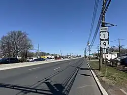 A short distance later, US 1/9 crosses into Rahway, Union County, where the road crosses the Rahway River before interchanging with Lawrence Street (CR 514) in the southbound direction.[1] The highway turns more northeast, becoming known as Edgar Road in Linden. In Linden, US 1/9 passes through a mix of industrial and business areas, crossing under Conrail Shared Assets Operations' Linden Industrial Track line before passing between Linden Airport and the former Linden Assembly plant used by General Motors to the west. Following the intersection with South Stiles Street (CR 615), the road enters more urbanized areas of homes and businesses. After passing near a couple of cemeteries, the highway runs to the west of Phillips 66's Bayway Refinery before passing under a Staten Island Railway freight line that is used by Conrail Shared Assets Operations.[1][9] After this bridge, US 1/9 meets the western terminus of I-278 at a partial interchange with a northbound exit and southbound entrance from US 1/9.[1] Past this interchange, US 1/9 continues into Elizabeth, where it intersects with South Elmora Avenue/Bayway (Route 439) at the Bayway Circle, which has been modified to allow US 1/9 to run straight through. At this point, US 1/9 splits from Edgar Road.[1][9] From the Bayway Circle, the road turns more to the east before making a sharp turn to the north-northeast and crossing the Elizabeth River on a skyway, which ends at the intersection with East Jersey Street. The road continues north through urban neighborhoods as Spring Street, passing under Conrail Shared Assets Operations' Elizabeth Industrial Track line. The highway reaches an intersection with North Avenue, at which point US 1/9 turns into a freeway with a local–express lane configuration, carrying two local lanes and two express lanes in each direction for a total of eight lanes.[1] The freeway comes to an interchange with the northern terminus of Route 81, and it continues around the west side of Newark Airport.[1][9]