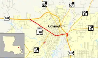 U.S. Highway 190 Business (internally known as U.S. Highway 190-X[1]) is a 3.31 mile (5.88 km) business route of US 190 in Covington, Louisiana.[2][3] It is known locally as 21st Avenue and Boston Street. The route is primarily used to access southbound Louisiana Highway 21 (LA 21) and Covington's business district. It also is Covington's road grid divider between north and south for a part of its length.