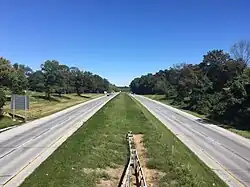 The freeway crosses Big Elk Creek into Penn Township and heads east to a diamond interchange at PA 796 north of the community of Jennersville. The route passes through a mix of fields, woods, and residential development as it continues east into London Grove Township and crosses Middle Branch White Clay Creek before it comes to a partial cloverleaf interchange at PA 841 north of the borough of West Grove. US 1 curves northeast and reaches a diamond interchange serving PA 41 northwest of the borough of Avondale. The freeway continues through rural land with some development and bends to the east, crossing the East Branch White Clay Creek, heading into New Garden Township, and coming to a partial cloverleaf interchange at Newark Road north of the community of Toughkenamon. The route heads through wooded areas with some nearby residential development and crosses West Branch Red Clay Creek before it skirts into the southern portion of East Marlborough Township, where it has a diamond interchange with PA 82 north of the borough of Kennett Square. From here, US 1 continues east and enters Kennett Township, where it crosses East Branch Red Clay Creek and passes near more development, coming to the northern terminus of the freeway at a southbound exit and northbound entrance with the Baltimore Pike.[2][3]