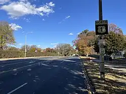 Past the I-476 interchange, US 1 continues east and heads into business areas, where the freeway ends and the route becomes four-lane divided South State Road, passing south of a shopping center. The route crosses into Springfield Township and reaches a diamond interchange with PA 320, with the southbound exit providing access to the shopping center. The road continues into residential areas and becomes North State Road upon crossing Springfield Road. US 1 curves northeast and crosses Darby Creek into Upper Darby Township, where it heads into business areas. State Road splits to the northeast and the route becomes Township Line Road, which heads north into Drexel Hill as a four-lane undivided road through residential neighborhoods. The road passes commercial development and curves to the northeast, forming the border between Haverford Township to the northwest and Upper Darby Township to the southeast. US 1 continues past homes as it heads through Drexel Hill, crossing Drexel Avenue and passing to the southeast of the Llanerch Country Club. The route heads into the community of Llanerch, where it gains a center left-turn lane and passes between a shopping center to the northwest and residences to the southeast. The road crosses Naylors Run and Darby Road/Lansdowne Avenue before it reaches an intersection with PA 3 a short distance later. From here, US 1 becomes a four-lane undivided road and continues northeast past residences and a few businesses before passing northwest of a golf course. The route passes over SEPTA's Norristown High Speed Line south of Township Line Road station before it comes to a bridge over Cobbs Creek.[2][4] Upon crossing Cobbs Creek, US 1 runs along the border between Haverford Township in Delaware County to the northwest and the city of Philadelphia in Philadelphia County to the southeast, passing between homes to the northwest and a golf course to the southeast.[2][4][5]