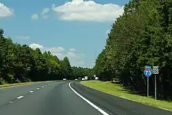 Approximately 0.5 miles (0.80 km) north of the Pineview Road interchange, I-73 and US 220 interchange with I-74, which diverges to the northwest toward High Point. I-73 and US 220 continue concurrently to the north along a four-lane freeway. The highway begins to travel around the western side of Randleman, and a partial cloverleaf interchange with a former segment of US 311 is located to the southwest of downtown Randleman. Immediately north of the interchange, I-73 and US 220 cross underneath a railroad owned by the Norfolk Southern Railway.[2] I-73 and US 220 interchange with Academy Street west of downtown Randleman, and several commercial businesses are located off of the exit. The highway makes a sweeping curve to the northwest as it travels north of the interchange and enters into a rural area of Randolph County. It utilizes a partial causeway and bridge to cross Randleman Lake immediately following the curve. North of the lake crossing, I-73 and US 220 travel north, parallel with the lakeshore. An interchange with US 220 Business is located southwest of Level Cross. The highway then bypasses the community to the west and crosses into Guilford County approximately 2.0 miles (3.2 km) north of the US 220 Business interchange.[1][3]