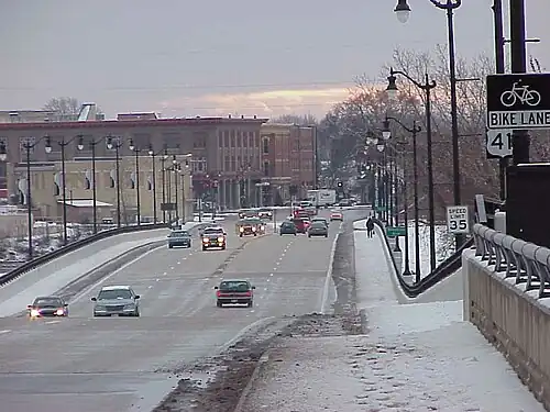 Construction started on November 1, 2004, to replace the Interstate Bridge carrying US 41 between Marinette, Wisconsin, and Menominee.[48] The project wrapped up on November 22, 2005, when the new bridge opened to traffic.[49] A ribbon-cutting ceremony was held on December 3, 2005, to celebrate the replacement of the 1929 structure.[50] In 2011, MDOT raised the speed limit along the expressway section in Delta County to 65 mph (105 km/h),[51] although truck traffic remained set at 55 mph (89 km/h) until 2017.[52]