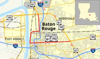 U.S. Highway 61/190 Business (internally designated as U.S. Highway 61-X)[2] is a business route of both U.S. Route 61 and U.S. Route 190 in Louisiana that serves as a boulevard into downtown Baton Rouge. It spans 10.89 miles (17.53 km) in a southeast to northwest direction and it is signposted as Business 61/190, generally without directional shields. It follows parts of the former alignment of US 61/190 through Baton Rouge, which existed in downtown Baton Rouge from 1935[3] until 1960.[4]