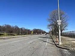 From the southern terminus, the route follows an eight-lane divided section of Broad Street that is also known as the Southern Boulevard Parkway, running between Franklin Delano Roosevelt Park to the west and the South Philadelphia Sports Complex to the east. At Pattison Avenue, SEPTA's Broad Street Line, a subway line, begins to run under the route from its southern terminus at NRG Station. Past the sports complex, the road runs through urban neighborhoods and comes to an interchange with I-76 (Schuylkill Expressway), which heads west across Philadelphia and east toward the Walt Whitman Bridge over the Delaware River into New Jersey.[3][4]