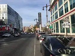The route was also shifted west to a new alignment between north of PA 113 and north of Ottsville, with the former alignment becoming Durham Road.[25] US 611 was extended further north along US 11 to end at US 6 at the northern edge of Scranton in the 1950s. In the 1950s, PA 291 replaced the PA 191 designation along Broad Street between Moyamensing Avenue and US 611 at Philadelphia City Hall.[26] In the 1950s, US 611 was upgraded to a divided highway between Philadelphia and PA 63 in Willow Grove, between Scotrun and PA 196 in Mount Pocono, and along a short stretch south of PA 490 (now PA 423) in Tobyhanna.[27] The section of US 611 between PA 590 in Elmhurst and Dunmore was improved to a divided highway in 1958, with the section of the route leading into Dunmore moved to a new alignment.[27][28]