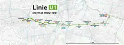 The U1 route was originally part of BII until 1957, where it was renamed to BIV until 1 March 1966. While the main section between Wittenbergplatz and Schlesisches Tor has been designated as line 1 since 1966, the western end of the line has changed twice. It was consequently renumbered to Line "3" and "U3" in 1993, before being renamed U15 until 2004.