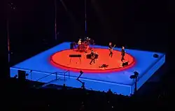 The surface of the stage was covered with several models of LED video tiles provided by Fuse:[109] 812 YesTech MG7S floor panels and 56 YesTech MG7S custom circular panels with a 3.9-millimetre (0.15 in) pixel pitch, 2 YesTech MG7S corner panels, 168 YesTech MG11 panels, 42 ROE Vanish V8T panels measuring 1 by 1 metre (3 ft 3 in × 3 ft 3 in), and 63 DesignLED custom flexible tiles measuring 400 by 225 millimetres (15.7 in × 8.9 in).[37] The ROE Vanish panels were chosen for the edges of the stage due to their acoustic transparency, allowing sound from speakers placed underneath the stage to reach the general admission audience.[37][108] Using the LED tiles, the stage could be lit by an ever-changing cycle of generative "colourscapes" using the algorithm from Eno's "Turntable".[3][110] At the request of Williams, Eno added a few rules to his algorithm to limit the intensity and duration of certain colours such as green that were considered problematic for lighting older performers.[19] Along the front and sides of the stage, robotic cameras filmed the shows;[108] the camera system used seven Sony Venice 2 units, two Marshall CV380s, two Panasonic UE-100s, and one Panasonic UE-150 PTZ.[19]