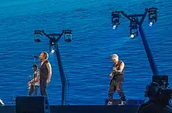 For "One", the video screen displayed a starfield,[135] along with closeups of the band members on digital billboards. The layout of the billboards replicated that of the video screens used on the Zoo TV Tour's "Outside Broadcast" and "Zooropa" legs.[123] An interlude followed during which the group performed a stripped-down cover of Presley's song "Love Me Tender",[131] accompanied by clips of Elvis's wedding to Priscilla Presley, John F. Kennedy's "We choose to go to the Moon" speech, and an Apollo rocket launch.[36][136] "Until the End of the World" was performed next, during which footage of storm clouds, lightning, and rising water were shown on screen.[119][137] The song culminated with Gerrard's video art piece "Flare", with showed a gas flare burning in the shape of a flag;[36] set in the open ocean, it was meant "to illustrate warming seas and pollution".[137] Transitioning into the song "Who's Gonna Ride Your Wild Horses", the screen showed flaming embers falling from the ceiling, as closeups of the band members were also shown.[36][134] For "Tryin' to Throw Your Arms Around the World", a digital chalk drawing of a balloon, designed by the Edge's wife Morleigh Steinberg, was displayed high on screen. It was attached to an actual tether of knotted-up bedsheets that Bono held onto from the stage. Initial performances featured him picking a fan from the crowd to join him on stage to hold the tether and swing in it.[138] For later performances, a prop door was added and visuals of a moving sidewalk were displayed on the stage floor, with the story being that Bono had returned home with the balloon only to realise he was locked out and unable to find his keys as he peered through the peephole; these changes were intended to give Bono's performance a narrative destination.[139][140]