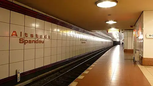 The U7 is a rail line on the Berlin U-Bahn. It runs completely underground for a length of 31.8 kilometres (19.8 mi) through 40 stations and connects Spandau, via Neukölln, to Gropiusstadt and Rudow.[2] The U7 was originally the south-eastern branch of the Nord-Süd-Bahn (U6) that ran between the branching point at Belle-Alliance-Straße (Mehringdamm) and Grenzallee; however, in the 1960s, this stretch was separated from the rest of the line and extended at each end to form a new line.