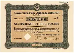 The plans envisaged by the German General Staff – especially those of Erich Ludendorff – went far beyond the creation of Bufa.[5] Ludendorff foresaw a large-scale, state-controlled film corporation that would serve national interests. In this spirit, Universum-Film AG (UFA) was founded as a consolidation of private film companies on December 18, 1917 in Berlin. The company's starting capital was 25 million Reichsmark (equivalent to 62 million 2021 €): among the contributors were the German government, the War Ministry and Deutsche Bank. The board chairman of the new company was Deutsche Bank director Emil Georg von Stauß.