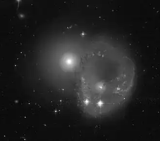 UGC 1840, also known as Arp 145, are a pair of interacting galaxies located 250 million light-years away from the Solar System in the Andromeda constellation.[2] The earliest known reference to the pair of galaxies is in part 2 of the Morphological Catalogue of Galaxies, published in 1964, where it is listed as MCG +07-06-002.[3]