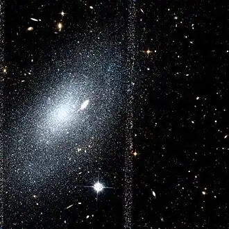 UGC 9405 (also known as PGC 52142) is a faint dwarf irregular galaxy situated in the constellation of Ursa Major. It is about 20.5 million light-years, or 6.3 megaparsecs, away from the Earth.[3] It is listed as a member of the M101 Group, a group containing the several galaxies orbiting the largest, Pinwheel Galaxy (M101).[5] However, due to its far distance from the Pinwheel Galaxy, its membership of the group is uncertain.[3]