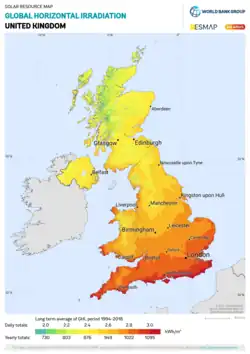 The UK's annual insolation is in the range of 750–1,100 kilowatt-hours per square metre (kWh/m2). London receives 0.52 and 4.74 kWh/m2 per day in December and July, respectively.[11] While the sunniest parts of the UK receive much less solar radiation than the sunniest parts of Europe, the country's insolation in the south is comparable with that of central European countries, including Germany, which generates about 10.7% of its electricity from solar power.[12] Additionally, the UK's higher wind speeds cool PV modules, leading to higher efficiencies than could be expected at these levels of insolation.[13] Capacity factors of solar PV reached values between 9.8% and 11.4% in the UK in the 2013-2022 period.[14]