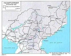 Convoys were ambushed twice by the KPA in the mountains near Mun'gyong. The ambush on 6 October caused nine casualties. The division headquarters was attacked on 9 October in the pass 5 km (3 mi) northwest of Mun'gyong; the North Koreans killed six men and destroyed several vehicles.[34]