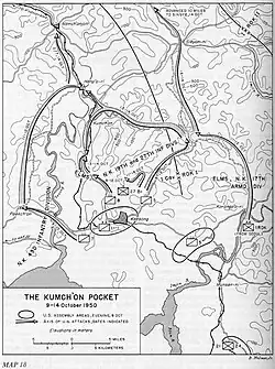 Earlier, on 4 October, the Far East Air Forces (FEAF) and the Fifth Air Force, acting on a directive of 8 July, had assumed control of the Marine squadrons at Kimpo. This was highly displeasing to X Corps, and particularly so to the Marines. But the change in control actually made little difference in air operations since FEAF directed that the 1st Marine Air Wing continue to support X Corps. The Fifth Air Force headquarters moved to Seoul on 15 October. As a result of the September victories, the Japan-based fighters and fighter-bombers of the Fifth Air Force moved to Korean bases. This permitted an increase in their armament load, more time over target and combat area, and lengthened flight ranges into North Korea.[38]