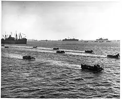 Loading was made more difficult by 9.4-metre (31 ft) tides, mud banks at low tide, and limited port facilities. The staging area was inadequate. Only seven Landing Ship, Tank (LSTs) or landing craft could beach at a time, and only at high tide. There was only one small pier to load vehicles onto Landing Craft Mechanized, again only at high tide. Vehicles were ferried to attack transports and amphibious cargo ships on LSTs, and the vehicles moved by cranes from the top decks of the landing craft to the ships. Bulk cargo was ferried out from the tidal basin.[32] X Corps requested that the port halt any daytime unloading that was unrelated to the corps, otherwise loading would be delayed for an estimated six to twenty days.[30] The 1st Marine Division was informed that 10 days of supplies would be bottom loaded, but this was not done and resulted in ships being reloaded. In reloading, X Corps drew considerably from supply dumps that could have been left for Eighth Army. Additional rations were flown in from Japan via Kimpo Airfield. Troops began embarking on 9 October. X Corps headquarters relocated to USS Mount McKinley on 11 October. Bulk cargo loading began on 8 October and continued until 16 October when all X Corps loading at Inchon was completed.[32]