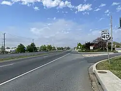 US 40 enters Maryland from Pennsylvania in Garrett County and follows a two-lane undivided road to Keysers Ridge. Between Keysers Ridge and Hancock, US 40 runs concurrent with I-68 across the mountains of Western Maryland, passing through Cumberland. In Hancock, US 40 becomes concurrent with I-70 and follows the Potomac River before it splits from I-70. US 40 follows a two-lane road parallel to I-70 east to Hagerstown, where it passes through the center of the city and turns southeast. Between Hagerstown and Frederick, the route heads southeast along a two-lane road parallel to I-70 through rural areas. In Frederick, US 40 joins US 15 on a freeway alignment before it continues east concurrent with I-70. US 40 follows I-70 east through rural areas to Howard County, where it splits from I-70 and continues along a multilane divided highway through suburban areas, passing through Ellicott City.[1][3] The route heads east through the city of Baltimore along city streets, with a freeway section located west of downtown Baltimore.[2][3] US 40 continues northeast from Baltimore along Pulaski Highway, a multilane divided highway that runs parallel to I-95 through suburban areas, passing through Aberdeen. Between Havre de Grace and Perryville, the route crosses the Susquehanna River on the Thomas J. Hatem Memorial Bridge. US 40 continues east parallel to I-95 and leaves Maryland for Delaware in Elkton.[1][3]