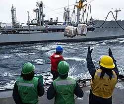 Henry J. Kaiser has five refueling stations, three on her starboard side and two on her port side, that allow her to pump fuel oil and/or jet fuel to ships on either side, or both sides simultaneously. When fueling, the ship extends hoses to the receiving ship, supported by a connecting span wire. While the ship has five refueling stations, she has sufficient crew to operate only three of them at a time in order to save money.[7] She also has two masts, one on each side of the ship, for the transfer of dry goods. Similar to refueling operations, span wires are kept under constant tension between these masts and receiving ships to form a trolley system, enabling the crew to deliver pallets of dry goods. This underway replenishment technology is referred to as the "standard tension replenishment alongside method".[15] This configuration of replenishment at sea where the two ships are physically connected is referred to as connected replenishment, or "conrep".[16]