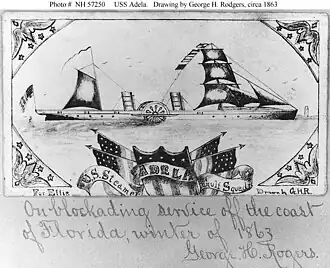 ![]() USS Adela (1863–1865) Drawing by George H. Rogers, depicting the ship "on blockading service off the coast of Florida, winter of 1863". The artist served on board Adela as a Pharmacist's Mate.