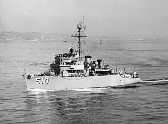 The minesweeper completed her outfitting in Boothbay Harbor and, after a stop at Boston, Massachusetts, for additional preparations, headed south for Charleston, South Carolina, near the end of the second week in July. She arrived at that port on 15 July and conducted four weeks of shakedown training. On 12 August, the ship began the long passage to the U.S. West Coast and her permanent assignment.