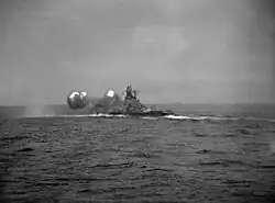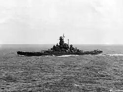 Alabama and five other fast battleships bombarded Nauru on 8 December, which the Japanese used as a source of phosphate. The destroyer Boyd, which had been hit by Japanese artillery fire, came alongside Alabama and transferred three wounded men to the battleship. The ships then escorted the carriers Bunker Hill and Monterey back to Efate, which they reached on 12 December. Alabama got underway on 5 January 1944 for Pearl Harbor, arriving on 12 January for maintenance that included replacing one of her propellers. She arrived in Funafuti in the Ellice Islands on 21 January, where she joined the fleet for the next operation in the campaign. She was assigned to Task Group (TG) 58.2, which sortied on 25 January to begin Operation Flintlock, the invasion of Kwajalein. Alabama, South Dakota, and the battleship North Carolina shelled the island of Roi-Namur over the course of 29 and 30 January, targeting defensive positions, airfields, and other facilities. For the remainder of the campaign, she patrolled to the north of Kwajalein to guard against a possible Japanese counterattack that did not materialize.[7][10]