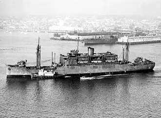 After a month of west coast shipyard overhaul, Barnett was reclassified APA-5 on 1 February 1943 and transferred to the east coast in March. Barnett loaded troops of the 45th Infantry Division for a Chesapeake Bay landing exercise at Cedar Point, Maryland, on 12 April. Barnett sailed from Norfolk, Virginia, on 10 May 1943 with convoy UGF 8A as flagship of the Third Transport Division commanded by Commodore Campbell Edgar, escorted by USS Savannah (CL-42) and 12 destroyers, and arrived in Oran, Algeria, on 23 May 1943. On 5 July 1943 Barnett sailed with convoy NCF 1 carrying the 26th Regimental Combat Team with General Theodore Roosevelt Jr.[9] to the Sicilian occupation. Barnett arrived at Gela, Sicily, at 0025 10 July 1943 and began landing troops at 0245 for the Amphibious Battle of Gela. During an Italian SM-79 bombing attack[10] off the coast of Sicily on 11 July 1943, a bomb burst close aboard Barnett's port bow abreast of the forward hatch putting a hole in the hull and causing subsequent flooding. The ship was made to list to starboard to bring the hole above the water line. Seven men were killed and 35 injured; all were Army personnel. On the evening of 12 July Barnett steamed under her own power with convoy CNF 1 to Algiers, Algeria, for repairs, arriving 15 July.[8]