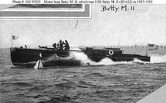 This article incorporates text from the public domain Dictionary of American Naval Fighting Ships. The entry can be found here.- Department of the Navy Naval History and Heritage Command Online Library of Selected Images: Civilian Ships: Betty M. II (American Motor Boat, 1916). Served as USS Betty M. II (SP-623) in 1917-1919