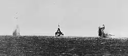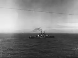 Later in the day, Birmingham received reports of Japanese aircraft approaching, and around the same time, one of the destroyers reported detecting a submarine just 2,000 yd (1,800 m) away. Birmingham immediately pulled away from Princeton so she could evade any incoming attacks. Only one Japanese aircraft actually approached the formation, but it did not attack, and the submarine report was determined to have been a false alarm. Birmingham then returned alongside Princeton to resume firefighting, but at 15:22, just as she was coming back alongside Princeton, the fires reached the carrier's aft magazines, setting off a catastrophic explosion. The blast destroyed much of the carrier's stern, throwing debris all along Birmingham's starboard side and inflicting grave casualties among the cruiser's crew.[3] Out of her crew of nearly 1,300, 241 men were killed, 211 were seriously wounded, and 201 received lighter injuries, more than half of the crew.[4] The surviving crew began fighting several fires aboard Birmingham and treating the survivors, and then she broke off from the stricken carrier. Efforts continued aboard Princeton, but these ultimately proved futile, and Reno and Irwin scuttled her with torpedoes. Birmingham eventually arrived back at Mare Island in early November for repairs; during this period, she also received modifications to allow her to serve as a flagship. Her propulsion system was also overhauled, and she received all new 5- and 6-inch gun barrels, along with additional 20- and 40-millimeter gun mounts. Work on the ship was completed on 17 January 1945.[3]