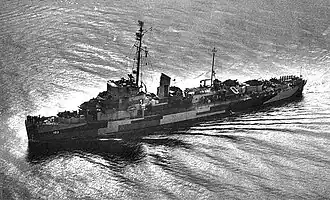 She was sold to nationalist China on 14 December 1948 and renamed Taicang (太倉) (DE-25).[1][2] Her name was struck from the US Navy list on 10 February 1949. When China was taken over by the Communists at the end of the Chinese Civil War, she escaped to Taiwan with Nationalist forces in 1949. On 13 February 1951, she led the task force under the direct order of ROC President Chiang Kai-shek to capture the Norwegian civilian freighter Hoi Houw at 24°13'N 123°18'E within the Japanese territory of Yaeyama Islands in the West Pacific Ocean.[3] On 4 October 1953, she joined the task force executing the blockade policy to capture the Polish civilian oil tanker Praca at 21°06'N 122°48'E in the Philippine Sea.[4] On 12 May 1954, she joined the fleet to bombard and capture another Polish civilian freighter Prezydent Gottwald with general cargo at 23°45′00″N 128°35′00″E / 23.75000°N 128.58333°E, east of Batanes Islands and south of Okinawa Island. All ships were confiscated into the Republic of China Navy list, and the crews were either released, executed or detained for various time frames up to 35 years in captivity till 1988.[3][5] She was scrapped in 1973.