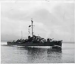 The destroyer escort continued to operate in the Philippines though the remainder of the war, escorting convoys from New Guinea to Leyte and Lingayen as well as within the Philippine Archipelago. Twice she screened shipping to the Palaus.[1] From 2 June, she served with the local naval defense force in Davao Gulf, providing communications for naval forces ashore as well as performing air-sea rescue missions. On the first day of her new assignment, she dashed under the guns of enemy-held Auqui Island to rescue 22 survivors of a downed Air Force transport. Charles J. Kimmel aided Filipino troops in their mop-up activities by bombarding Piso Point to dislodge approximately 600 Japanese soldiers.[1]