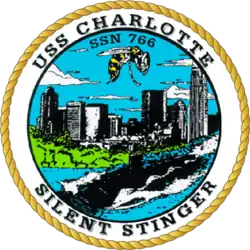 USS Charlotte (SSN-766), a Los Angeles-class submarine, is the fourth ship of the United States Navy to be named for Charlotte, North Carolina. The contract to build her was awarded to Newport News Shipbuilding and Dry Dock Company in Newport News, Virginia on 6 February 1987 and her keel was laid down on 17 August 1990. Sponsored by Mrs. Mary McComack, she was launched on 3 October 1992 and commissioned on 16 September 1994. She arrived at her homeport of Naval Station Pearl Harbor on 17 November 1995.[3]