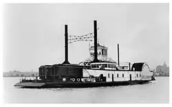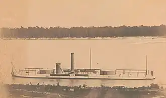 In March–April 1865, Chickasaw bombarded fortifications during the Battles of Spanish Fort and Fort Blakley.[15] Together with the ironclad Cincinnati and the steamboat Nyanza, under the overall command of Captain Edward Simpson, Chickasaw sailed up the Tombigbee River on 9 May 1865 to Nanna Hubba Bluff where Simpson accepted the surrender of the casemate ironclad Nashville, the gunboats Baltic and Morgan, and the river boat Black Diamond from Commodore Ebenezer Ferrand.[16] The monitor remained in the vicinity of Mobile Bay until 3 July when she sailed for New Orleans.