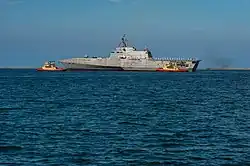 In 2002, the U.S. Navy initiated a program to develop the first of a fleet of littoral combat ships.[21] The Navy initially ordered two trimaran hulled ships from General Dynamics, which became known as the Independence-class littoral combat ships after the first ship of the class, USS Independence.[21] Even-numbered U.S. Navy littoral combat ships are built using the Independence-class trimaran design, while odd-numbered ships are based on a competing design, the conventional hull Freedom-class littoral combat ship.[21] The initial order of littoral combat ships involved a total of four ships, including two of the Independence-class design.[21]