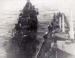 USS San Diego assists Haggard after Haggard was hit by a kamikaze, 29 April 1945.