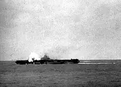 Hancock encountered Typhoon Cobra on 17 December 1944, in waves which broke over her flight deck, some 55 ft (20 m) above her waterline. She put into Ulithi 24 December and got underway six days later to attack airfields and shipping around the South China Sea. Her aircraft struck at Luzon airfields on 7–8 January 1945 and turned their attention back to Formosa on 9 January, hitting airfields and the Toko Seaplane Station.[1] An enemy convoy north of Camranh Bay, Indochina was the next target, with two ships sunk and 11 damaged. That afternoon Hancock launched strikes against airfields at Saigon and shipping on the northeastern bulge of French Indochina. Strikes by the fast and mobile carrier force continued through 16 January, hitting Hainan Island in the Gulf of Tonkin, the Pescadores Islands, and shipping in the harbor of Hong Kong. Raids against Formosa were resumed on 20 January. The next afternoon one of her aircraft returning from a sortie made a normal landing, taxied to a point abreast of the island before disintegrating in an explosion which killed 50 men and injured 75 others. Damage control work brought the fires under control in time to land the other aircraft of the same flight. She returned to formation and launched strikes against Okinawa the next morning. Hancock reached Ulithi on 25 January, where Admiral McCain left the ship and relinquished command of the 5th Fleet.[2]