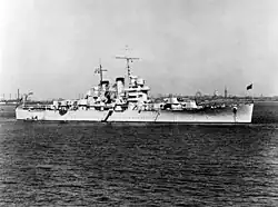 The US Navy awarded the contract for Helena to the New York Navy Yard on 9 September 1935, and the keel for the new ship was laid down on 9 December 1936. Her completed hull was launched on 28 August 1938 and she was commissioned on 18 September 1939 with the hull number CL-50.[2][16][17] World War II had broken out in Europe in September that year, but for the time being, the United States remained neutral. After entering service, the ship was occupied with sea trials and initial training, and she embarked on a major shakedown cruise abroad on 27 December, bound for South American waters. She stopped in Guantanamo Bay, an American-leased naval base in Cuba, on the way before arriving in Buenos Aires, Argentina, on 22 January 1940; from there, she continued on to Montevideo, Uruguay, on 29 January. While in the latter port, the crew inspected the wreck of the German heavy cruiser Admiral Graf Spee that had recently been scuttled after the Battle of the River Plate the previous month. Helena got underway again in mid-February to return to the United States, again passing through Guantanamo Bay on the way. After returning, she was dry-docked for repairs from 2 March to 14 July.[16][18]