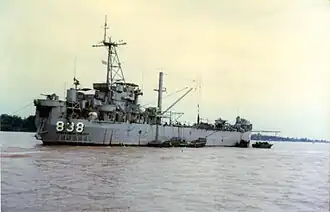 The ship's credits in Vietnam include capturing one of the largest VC in the Delta on 29 March 1969, and establishing the record for the furthest transit of the Bassac River by a U.S. commissioned vessel in August of that same year.[4] The ship was subsequently reclassified as Patrol Craft Tender USS Hunterdon County (AGP-838).