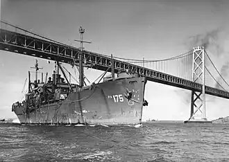 ![]() USS Karnes (APA-175) passing under the San Francisco-Oakland Bay Bridge, late 1945 or early '46