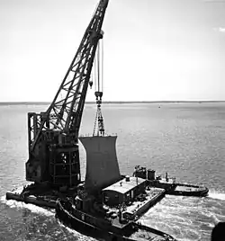 Kentucky was never completed, instead serving as a parts hulk while in the mothball fleet at the Philadelphia Naval Shipyard from about 1950 to 1958.[24] Hurricane Hazel hit the area on 15 October 1954, causing Kentucky to break free from her moorings and run aground in the Delaware River.[28] In 1956, Kentucky's bow was removed and used in the repair of Wisconsin, which had been damaged in a collision with the destroyer USS Eaton on 6 May 1956.[24] Congressman William Huston Natcher attempted to block the sale of the ship by objecting to the bill in August 1957.[29] Nevertheless, Kentucky was struck from the Naval Vessel Register on 9 June 1958 and her incomplete hulk was sold for scrapping to Boston Metals Company of Baltimore, Maryland on 31 October for $1,176,666.[19][30] She was towed to their shipyard in Baltimore in February 1959.[27]