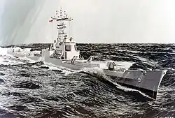 Long Beach was originally intended to be a smaller frigate, but was then redesigned and expanded to a cruiser hull, allowing for an open space just aft of the bridge "box". This open space was first planned to accommodate the mounting of a Regulus nuclear-armed cruise missile, but was then changed to four launch tubes for the Polaris missile. However, the space was eventually occupied by the 5-inch/38-caliber gun mounts and the ASROC system.[4] Long Beach was the last cruiser built with a World War II-era cruiser hull style,[5][6] as later new-build cruisers were built with different hull forms, such as the converted frigates Leahy, Bainbridge, Belknap, Truxtun, and the California and Virginia classes, or the Ticonderoga-class cruiser that was built on a Spruance-class destroyer hull.