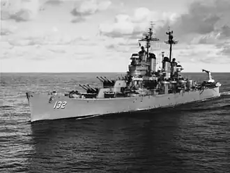 USS Macon (CA-132), a Baltimore-class heavy cruiser of the United States Navy, was laid down on 14 June 1943 by the New York Shipbuilding Corp., Camden, New Jersey; launched on 15 October 1944; sponsored by Mrs. Charles F. Bowden, wife of the mayor of Macon, Georgia; and commissioned on 26 August 1945 at Philadelphia, Captain Edward Everett Pare in command.