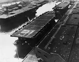 Makassar Strait was a Casablanca-class escort carrier, the most numerous type of aircraft carrier ever built,[2] and designed specifically to be mass-produced using prefabricated sections, in order to replace heavy early war losses. Standardized with her sister ships, she was 512 ft 3 in (156.13 m) long overall, had a beam of 65 ft 2 in (19.86 m), and a draft of 20 ft 9 in (6.32 m). She displaced 8,188 long tons (8,319 t) standard, 10,902 long tons (11,077 t) with a full load. She had a 257 ft (78 m) long hangar deck and a 477 ft (145 m) long flight deck. She was powered with two Skinner Unaflow reciprocating steam engines, which drove two shafts, providing 9,000 shaft horsepower (6,700 kW), thus enabling her to make 19 knots (35 km/h; 22 mph). The ship had a cruising range of 10,240 nautical miles (18,960 km; 11,780 mi) at a speed of 15 knots (28 km/h; 17 mph). Her compact size necessitated the installment of an aircraft catapult at her bow, and there were two aircraft elevators to facilitate movement of aircraft between the flight and hangar deck: one each fore and aft.[3][2][4]
