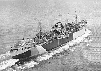 ![]() USS Menkar (AK-123) underway, date and location unknown. Note dazzle camouflage scheme.