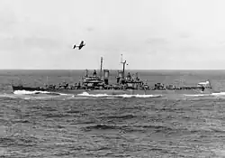 During the ensuing Formosa Air Battle on 13 October, Mobile's sister ship Houston and the heavy cruiser Canberra were both torpedoed and badly damaged by Japanese aircraft. Mobile and several other vessels were detached from TF 38 to cover the withdrawal of what was nicknamed "Cripple Division 1". The American forces hoped that further Japanese forces would be lured out to be destroyed, but the Americans were detected by Japanese scout aircraft and the bait was not taken. Once the damaged vessels had withdrawn far enough to be out of range of Japanese aircraft, Mobile left the formation and returned to TG 38.3, arriving with her unit on 17 October.[3][4]